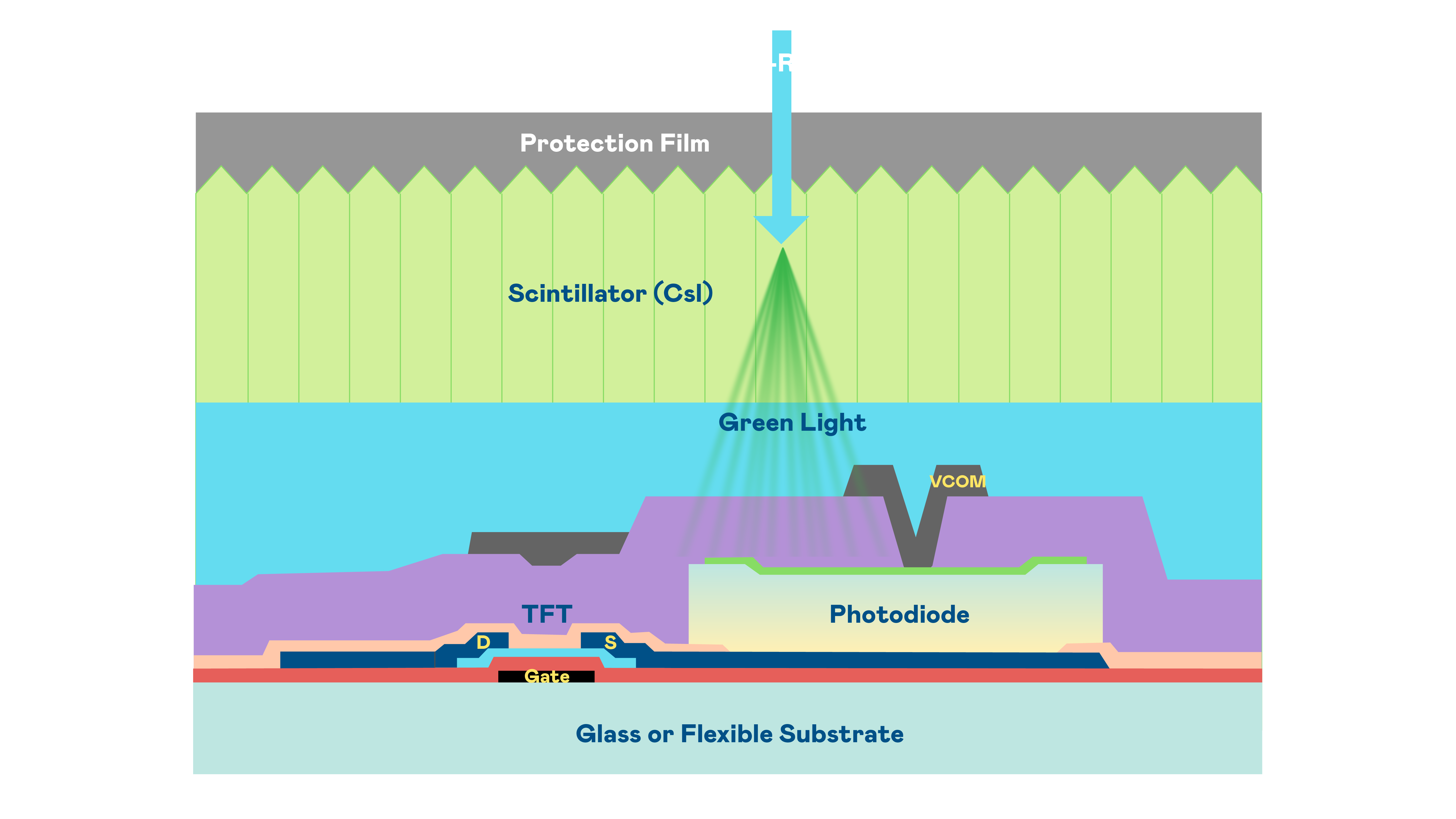 DB电竞的X光影像感测阵列使用薄膜电晶体 (TFT) 作为每个像素的读取开关,搭配光电二极体(Photodiode)的光电转换元件,用以感测X光影像讯号。